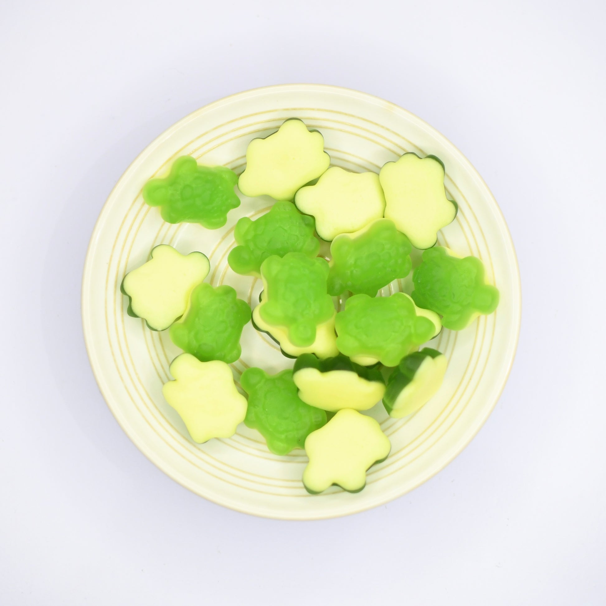 Ingredients: Glucose Syrup, Sugar, Water, Gelatine (Pork), Acids (Lactic Acid, Malic Acid, Citric Acid), Maltodextrin, Flavouring, Plant Concentrates (Spirulina, Safflower), Colour (Curcumin), Vegetable Oil (Coconut), Glazing Agent (Carnauba Wax).